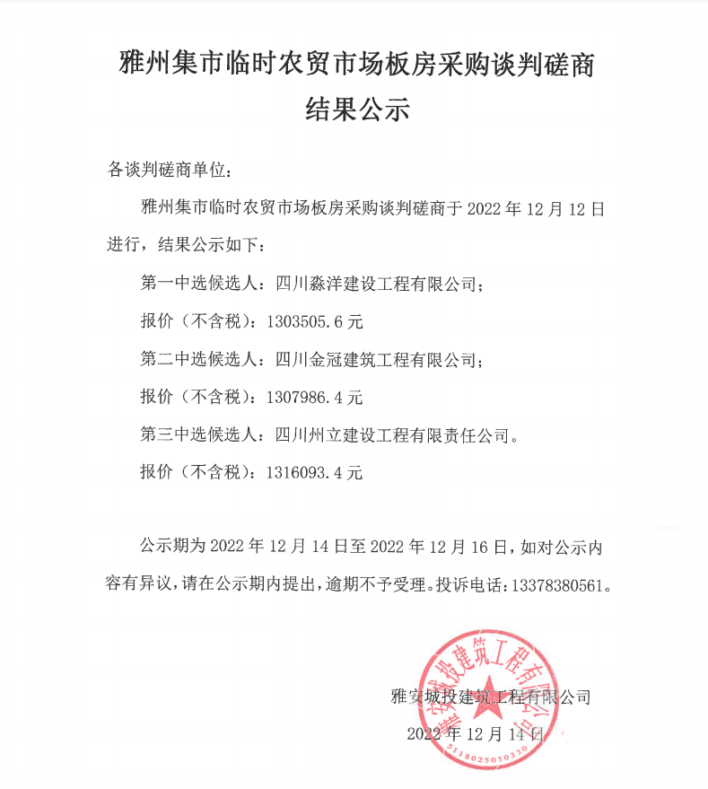 雅州集市臨時(shí)農(nóng)貿(mào)市場(chǎng)板房采購(gòu)談判磋商結(jié)果公示
