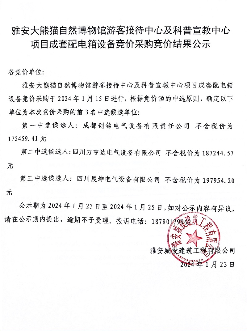 雅安大熊貓自然博物館游客接待中心及科普宣教中心項目成套配電箱設備競價采購競價結果公示