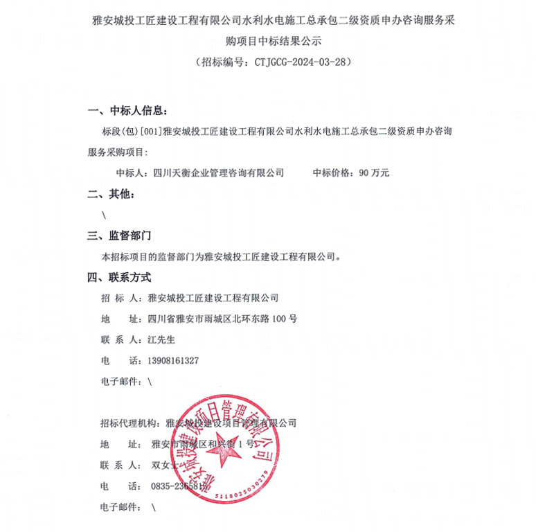 雅安城投工匠建設工程有限公司水利水電施工總承包二級資質申辦咨詢服務采購項目中標結果公示
