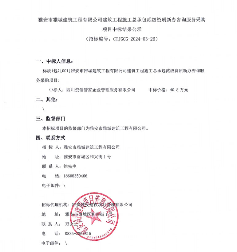雅安市雅城建筑工程有限公司建筑工程施工總承包貳級資質(zhì)新辦咨詢服務采購項目中標結(jié)果公示