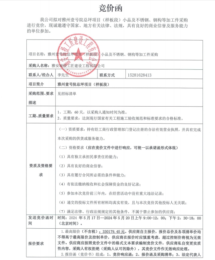 雅州壹號院總坪項(xiàng)目(樣板段)小品及不銹鋼、鋼構(gòu)等加工件采購競價(jià)公告