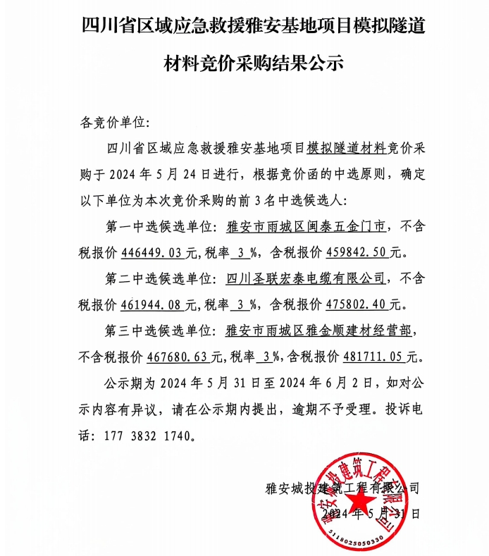 四川省區(qū)域應(yīng)急救援雅安基地項目模擬隧道材料競價采購結(jié)果公示