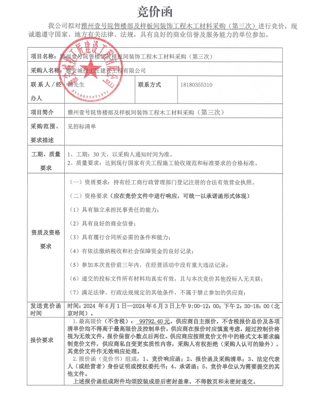 競價(jià)函-木工材料采購-雅州壹號(hào)院售樓部及樣板間(第三次)