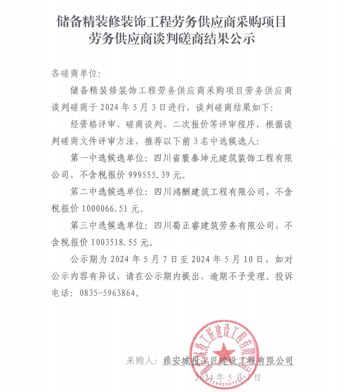 儲備精裝修裝飾工程勞務(wù)供應(yīng)商采購項目勞務(wù)供應(yīng)商談判磋商結(jié)果公示