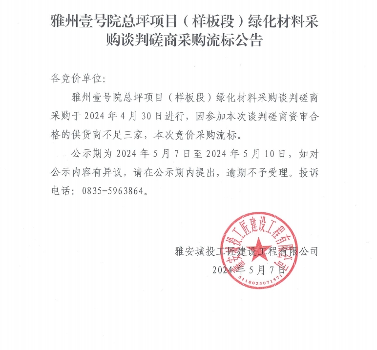 雅州壹號院總坪項目(樣板段)綠化材料采購談判磋商采購流標(biāo)公告