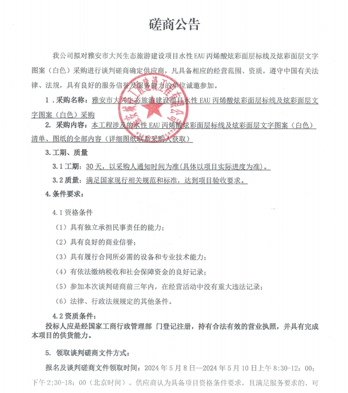 雅安市大興生態(tài)旅游建設(shè)項(xiàng)目水性EAU丙烯酸炫彩面層標(biāo)線及炫彩面層文字圖案(白色)采購(gòu)磋商公告