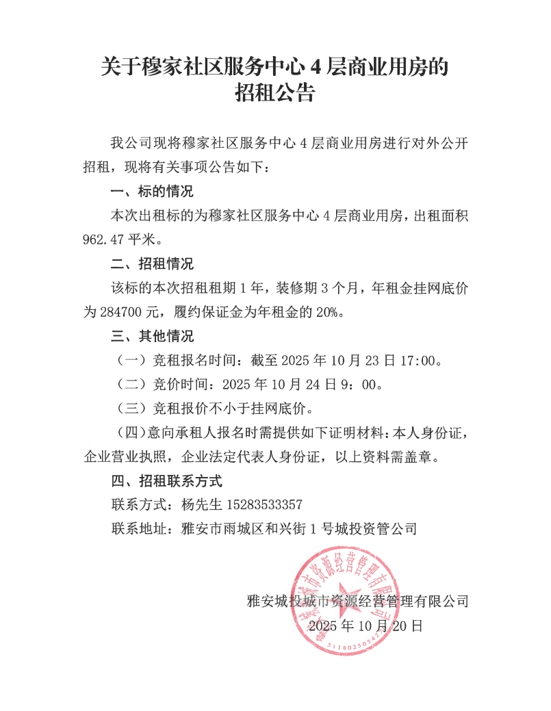 關于穆家社區(qū)服務中心4層商業(yè)用房的招租公告